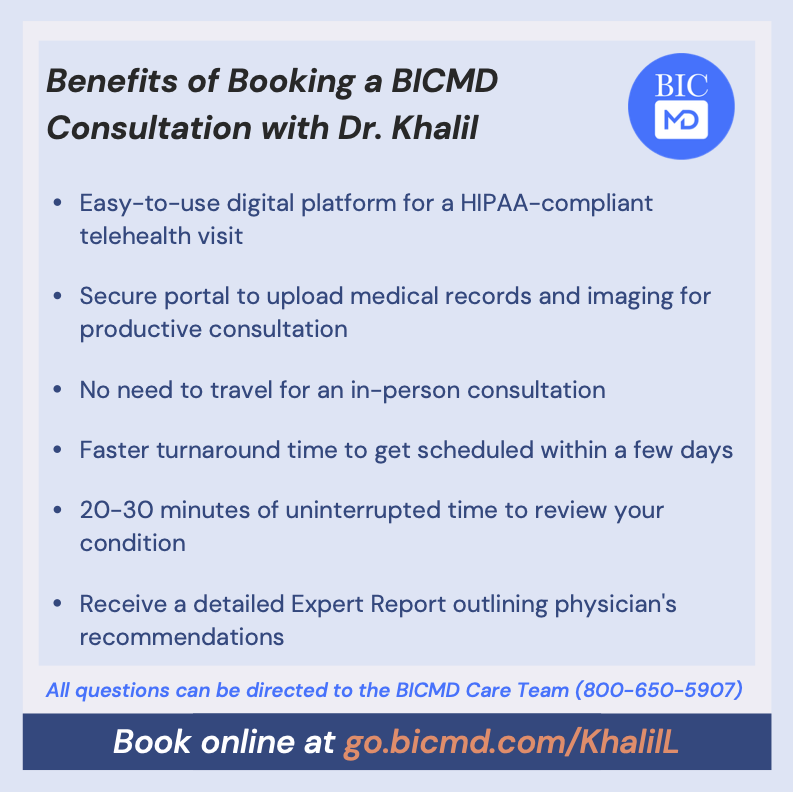 If you would like to set up a virtual second opinion or imaging review with Dr. Khalil, please visit the link below to schedule an appointment quickly through Best In Class MD. This comprehensive service includes a thorough review of your medical records and imaging, a telehealth visit, and written recommendations outlined in an Expert Report. This service is particularly applicable to out-of-state or international individuals, or those looking to expedite an initial consultation. Schedule now at go.BICMD.com/KhalilL.